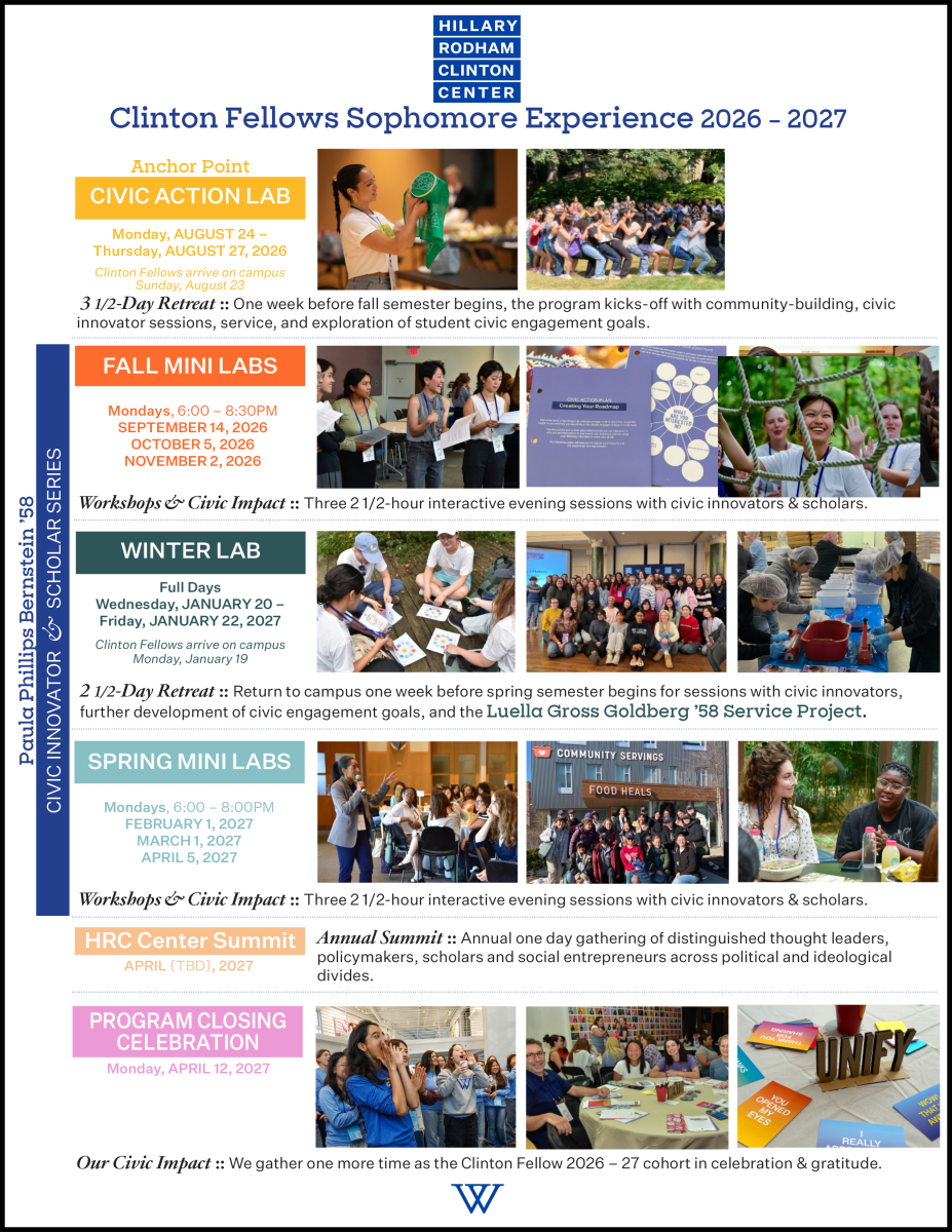 The Clinton Fellows program is designed for all sophomore students (Class of 2029) — regardless of major, career aspiration, or prior experience. This is a unique sophomore year experience offered by the Hillary Rodham Clinton Center. You will build skills, gain exposure to strategies for impact and practice in constructive dialogue along with meeting civic innovators across sectors.